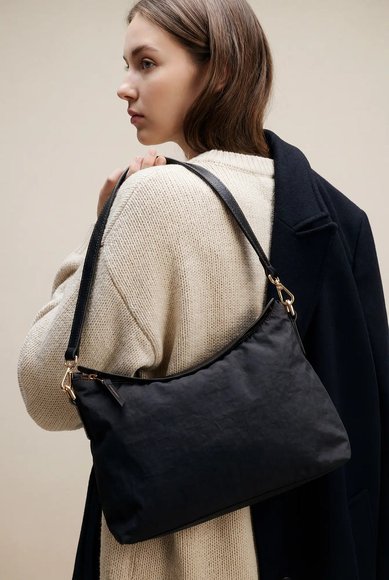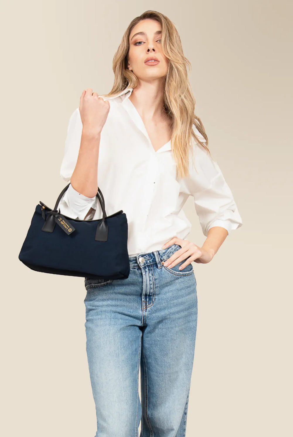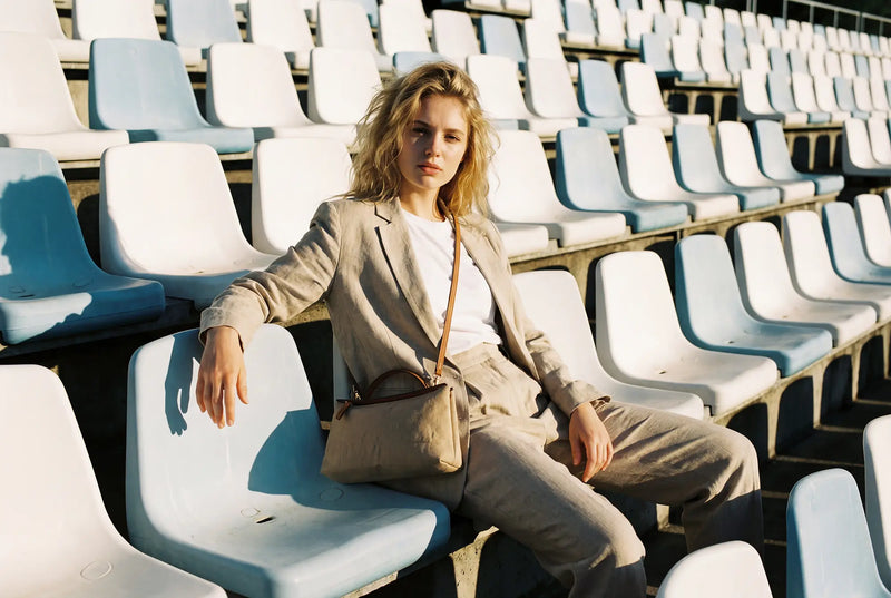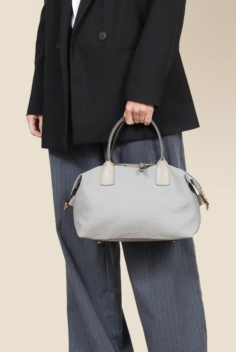 Linylen® is Roberta Pieri’s innovative fabric. It captures the natural elegance of linen/cotton while being a breakthrough 100% nylon fabric. Through a proprietary finishing process, the fiber gains remarkable structure and water-repellent performance, so our bags keep their crisp silhouette without extra internal reinforcements. The result: lighter carry, cleaner construction, and less material waste.