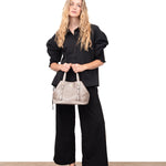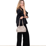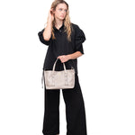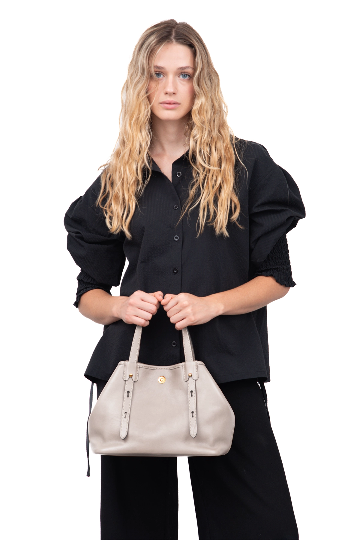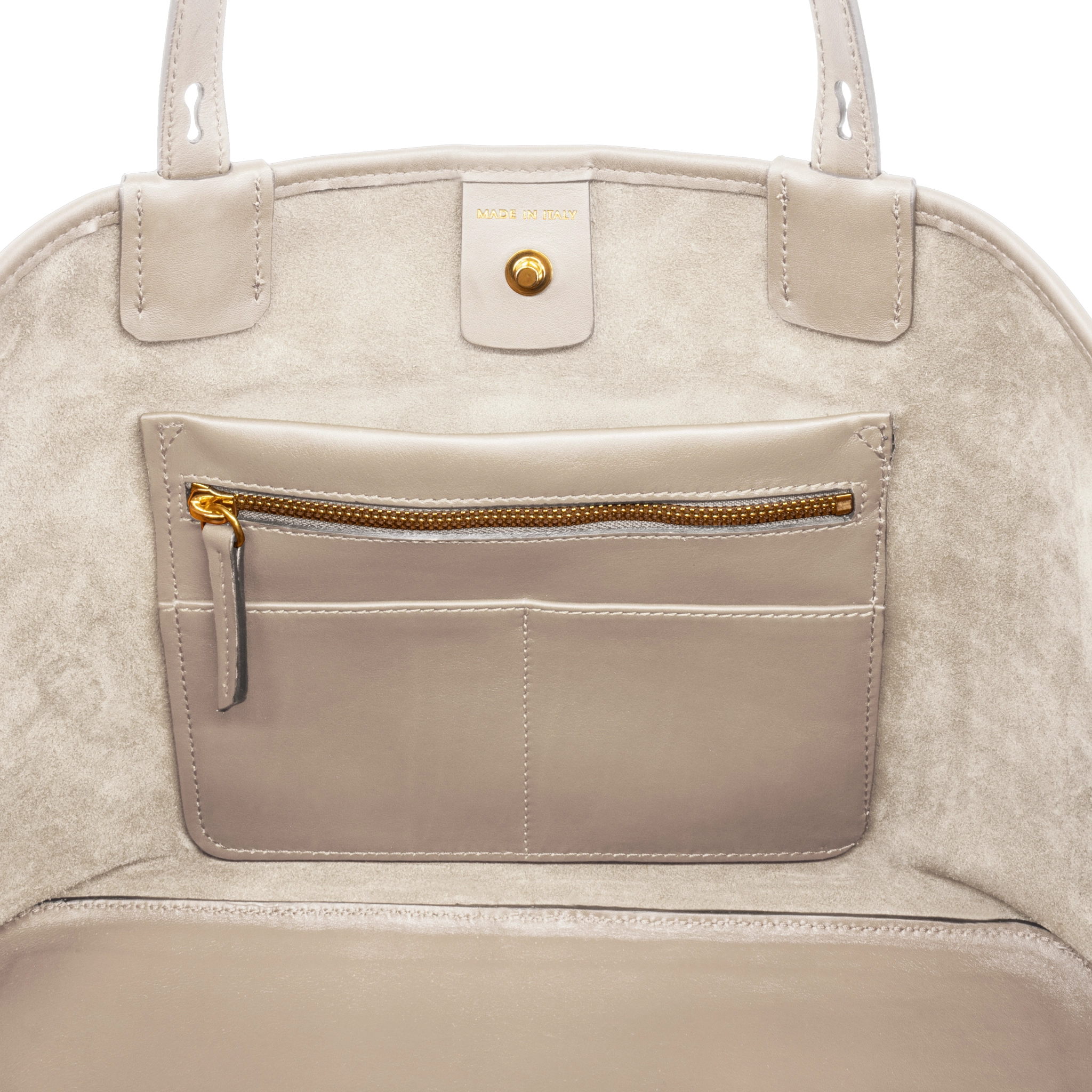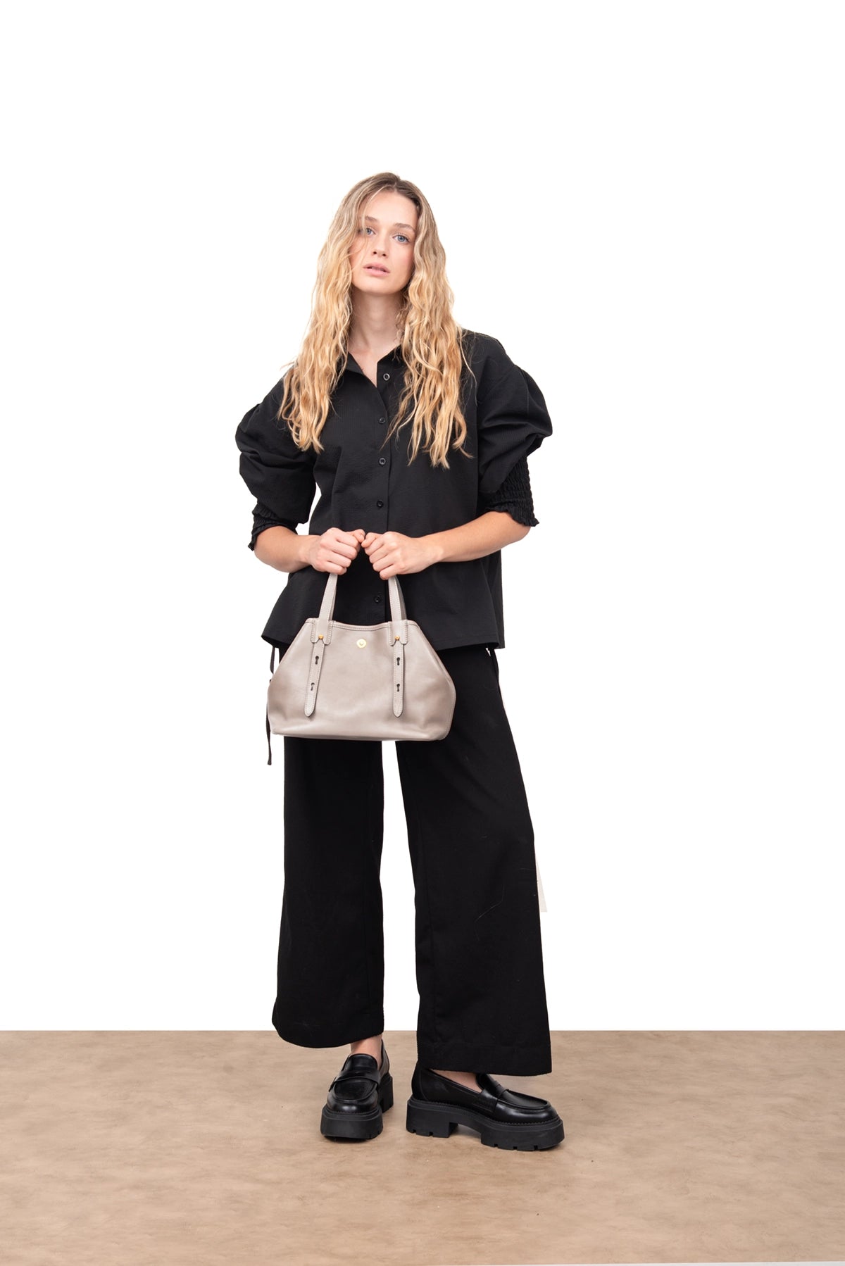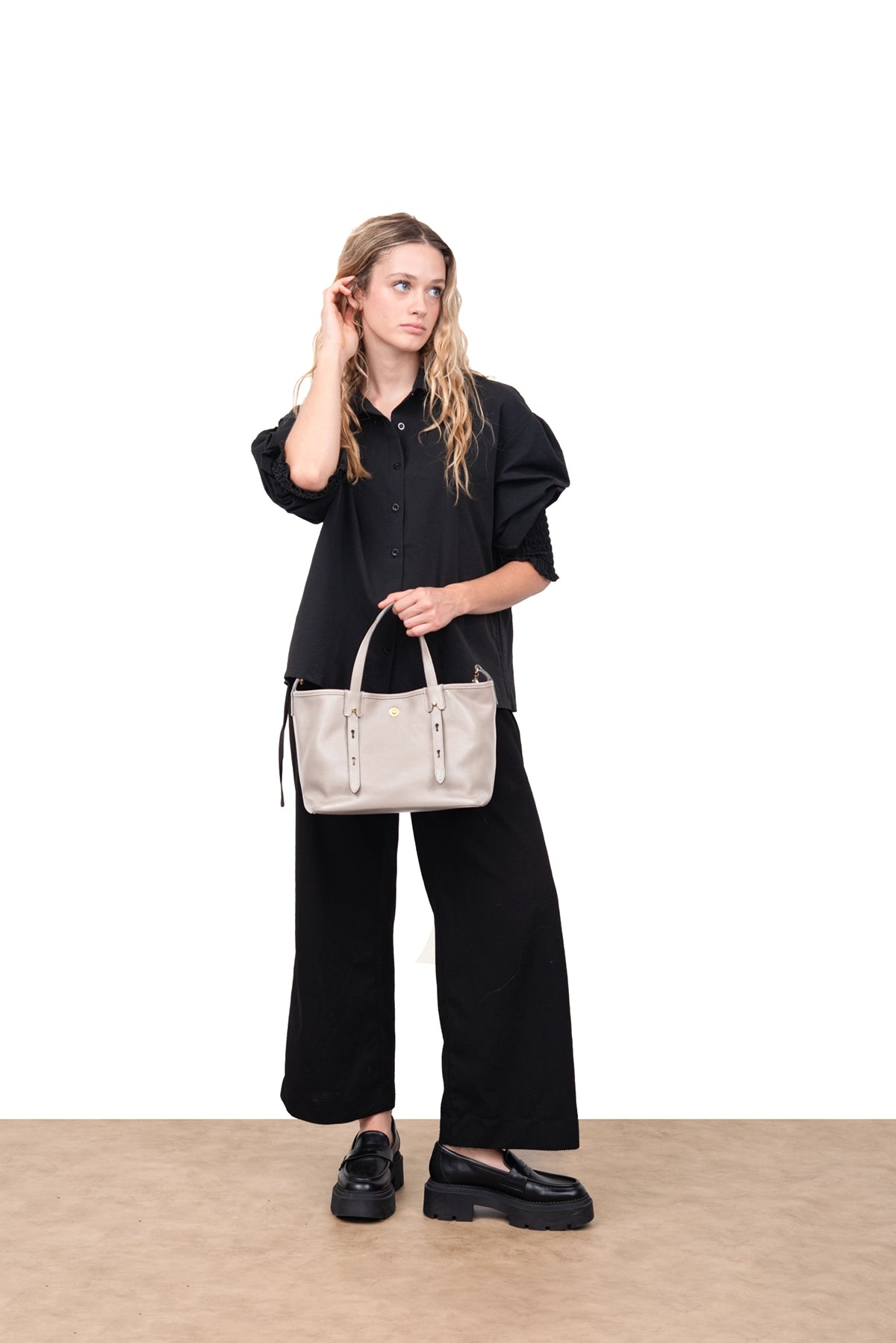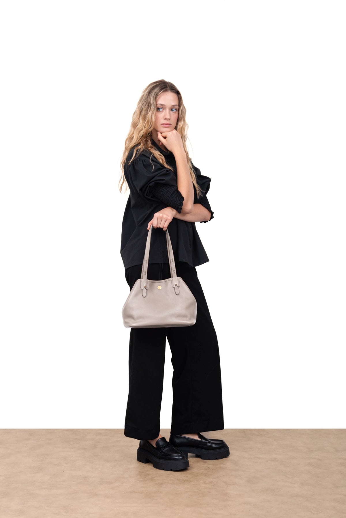 Compact but spacious, Emma is perfect from morning meetings to evening plans. The adjustable leather handles let you carry it by hand or over the shoulder, adapting gracefully to your day. A sliding zip with nickel hooks adds a polished finish, while the well-organized interior keeps essentials neatly in place.